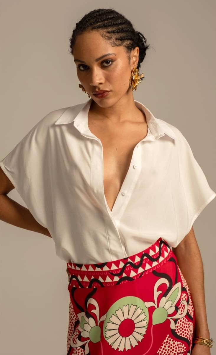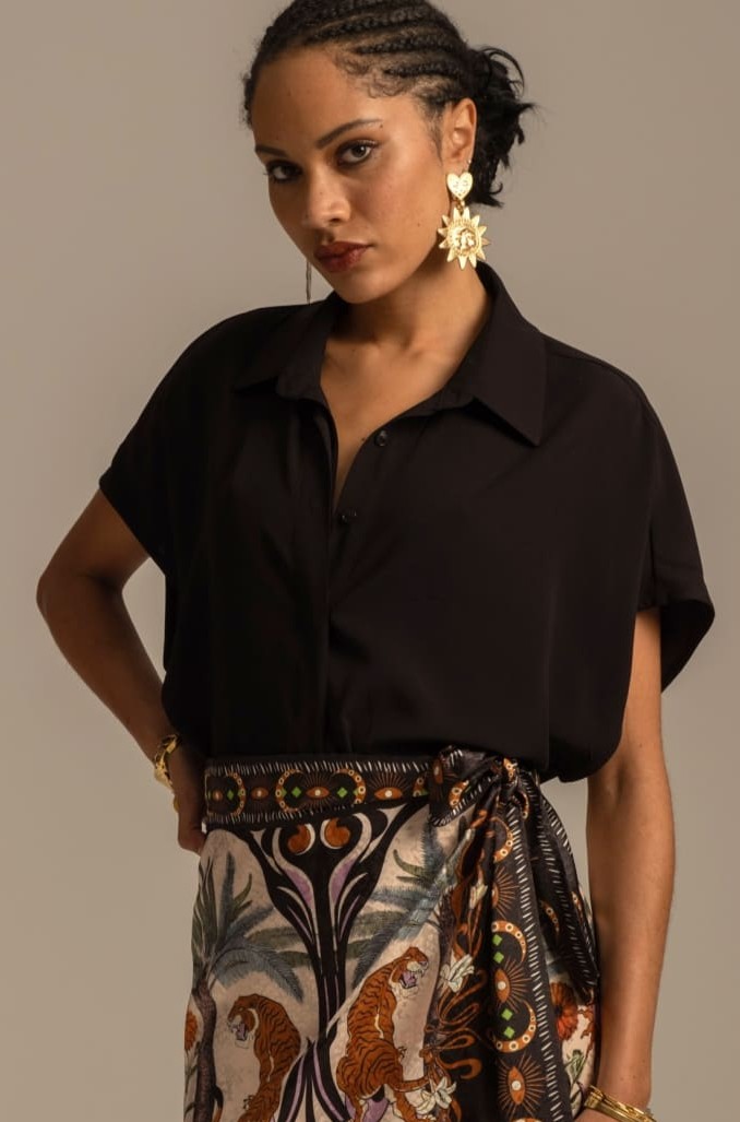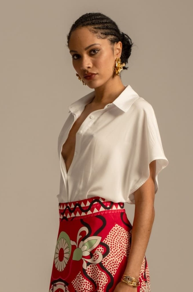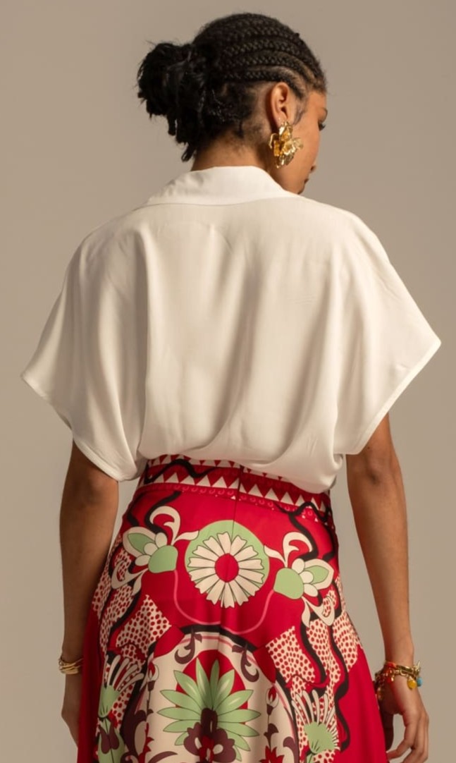 Το Lily Shirt, φτιαγμένο από απαλό, silky ρεγιόν, προσφέρει κομψότητα και άνεση. Τα κρυφά κουμπιά του δίνουν μια tailored αίσθηση, ενώ το μεταλλικό σύμβολο Chaka και τα αέρινα μανίκια το κάνουν ακόμα πιο ξεχωριστό. Διαθέσιμο σε λευκό και μαύρο χρώμα, ταιριάζει εύκολα με τα Moonflower Pants ή τη Mandala Maxi Skirt για ένα ολοκληρωμένο look.