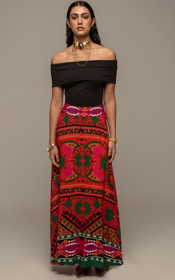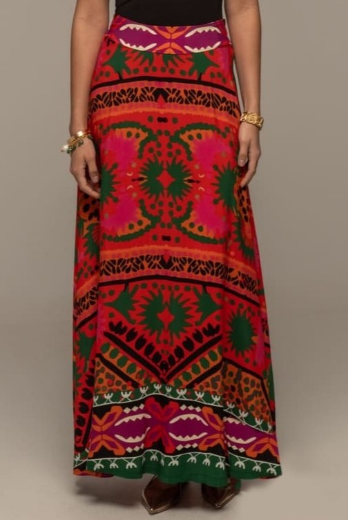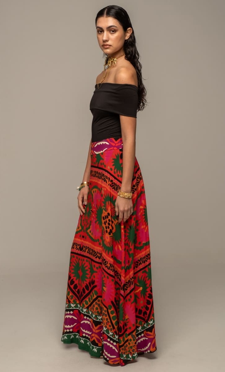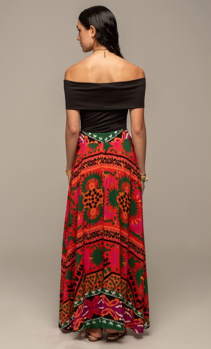 Η Rapture Long Skirt συνδυάζει την παραδοσιακή αισθητική και το μοντέρνο στυλ με τον συνδυασμό των πολύχρωμων prints της. Η ζώνη της στέκεται ψηλά στη μέση ενώ το all-over print στο ελαφρύ viscose ύφασμα δημιουργεί μια A-line γραμμή. Έχει ελαστική ζώνη στο πίσω μέρος και κρυφό φερμουάρ στο πλάι.