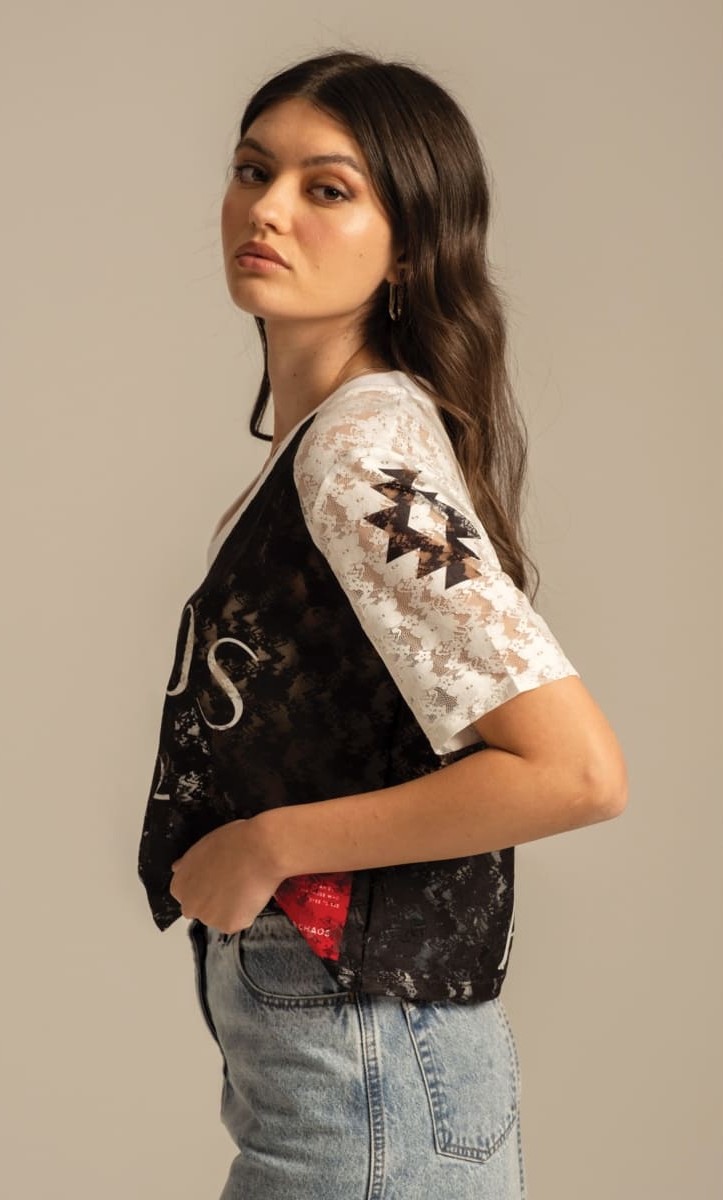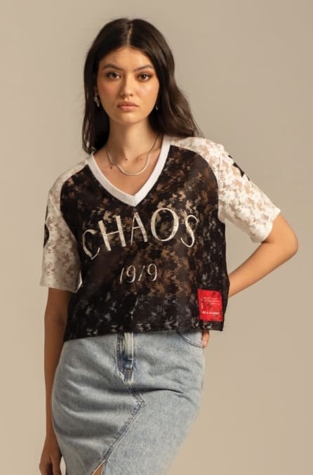 Αέρινη δαντέλα και δυναμικό στυλ συναντιούνται στο Cosmos Lace Crop Top. Οι αθλητικές λεπτομέρειες του placement print περιλαμβάνουν το λογότυπο Peace στην πλάτη, το Chaos μπροστά και το σύμβολο Chaka στο μανίκι. Αυτό το ελαστικό, διάφανο τοπ από δαντέλα σε μαύρο και λευκό χρώμα έχει boxy γραμμή, V λαιμόκοψη με ριμπ λεπτομέρεια και μια ιδιαίτερη κόκκινη υφαντή ετικέτα P+C.