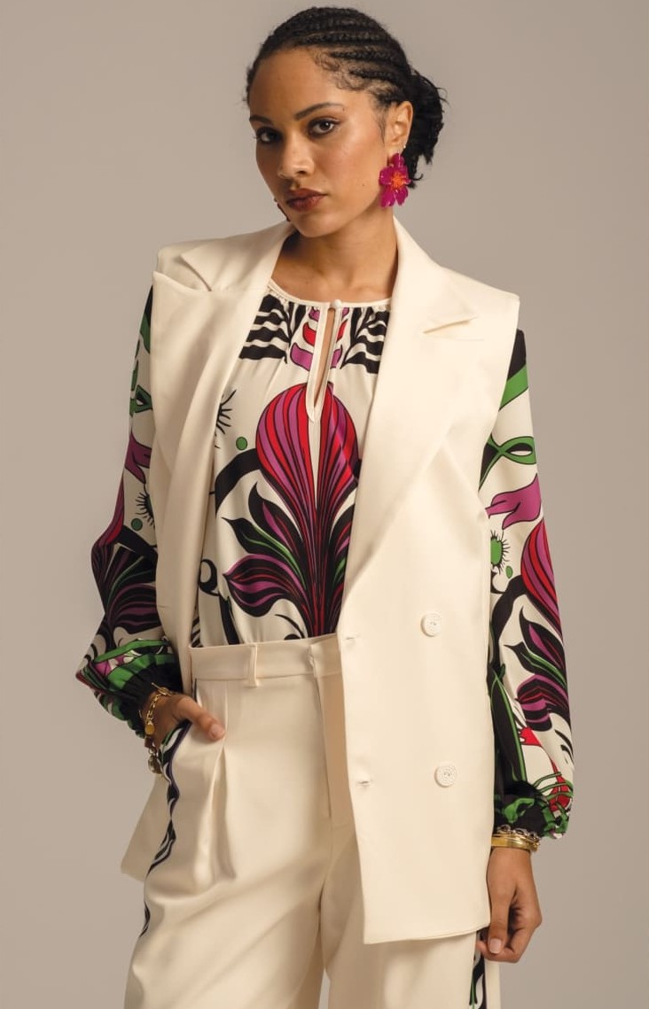 Το αμάνικο σακάκι Botany με το διπλό κλείσιμο είναι η ιδανική επιλογή για την ανοιξιάτικη γκαρνταρόμπα σας. Με φαρδύ πέτο, διπλές τσέπες και σατέν επένδυση, προσφέρει έναν αέρα κομψότητας.  Η λεπτομέρεια με τις ρίγες με σχέδιο εμπνευσμένο από τη φύση και τη χαρακτηριστική υφαντή ετικέτα P+C συνεχίζεται και στα αντίστοιχα παντελόνια.