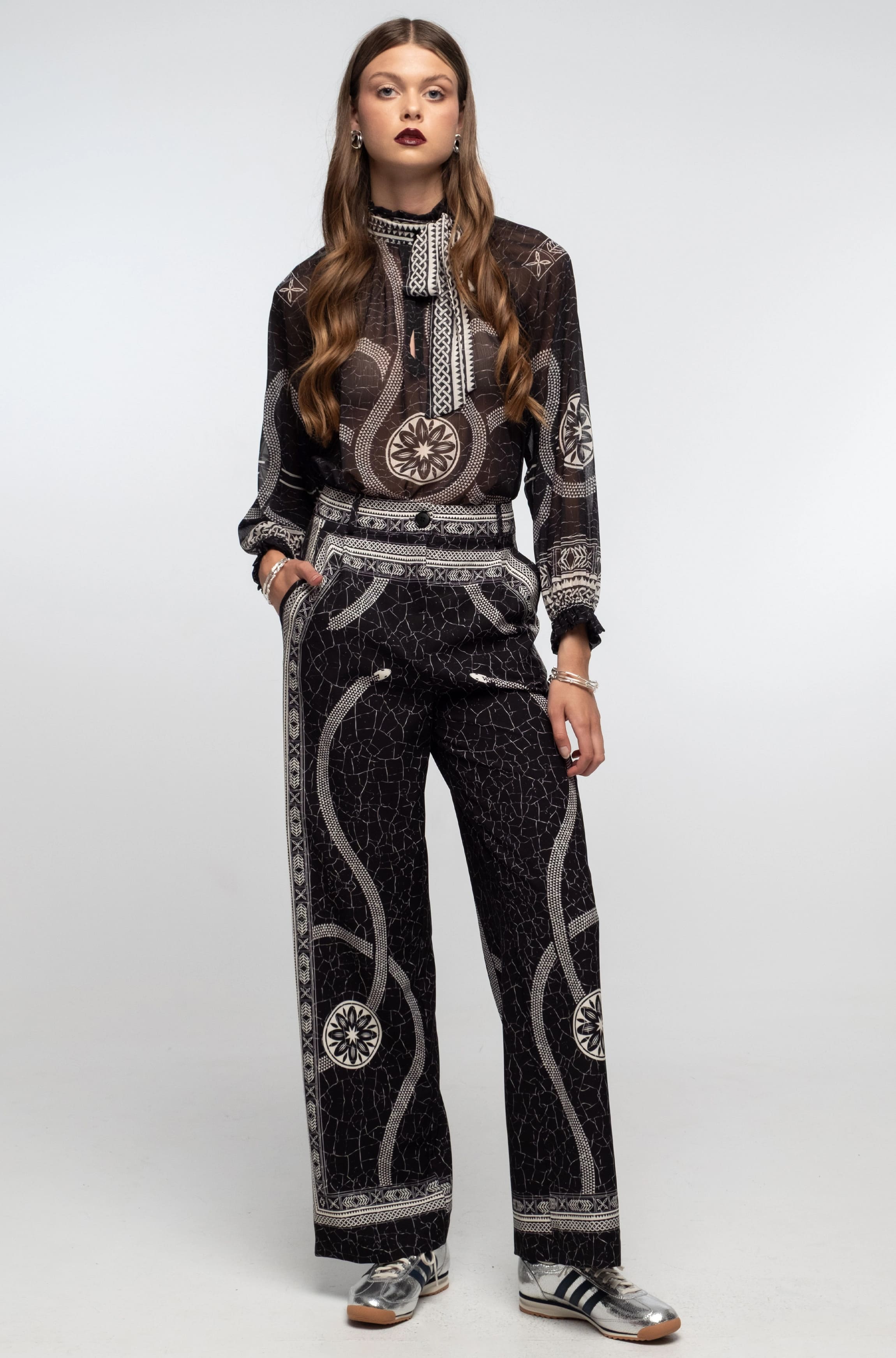 Το Philosophy Top ξεχωρίζει με τις θηλυκές του λεπτομέρειες, όπως τα βολάν στις ελαστικές μανσέτες, τον ψηλό γιακά και την αποσπώμενη κορδέλα στον λαιμό. Το ημιδιάφανο ύφασμα από crinkle georgette το κάνει εύκολο να συνδυαστεί σε μονόχρωμα σύνολα. Φορέστε το με το μαύρο Vital Top και τα Philosophy Pants για ένα casual chic look ή με τη Philosophy Midi Skirt για μια πιο κομψή εμφάνιση.