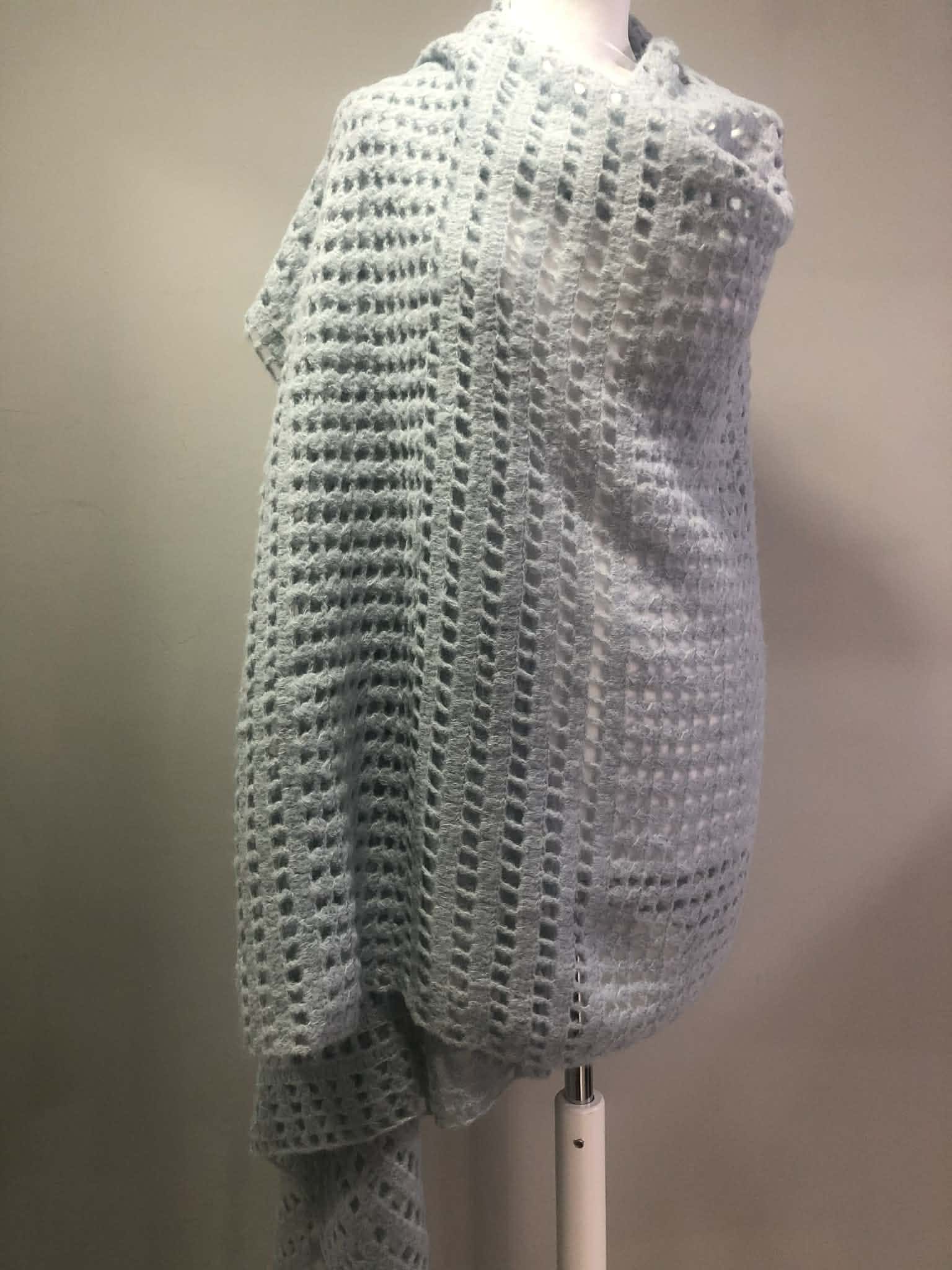 Μία ντελικάτη πασμίνα με διάτρητη πλέξη σε απαλό mint χρώμα, που προσφέρει ανάλαφρη υφή και όμορφη εφαρμογή. Ιδανική για layering, προσθέτει διακριτή κομψότητα σε κάθε εμφάνιση.