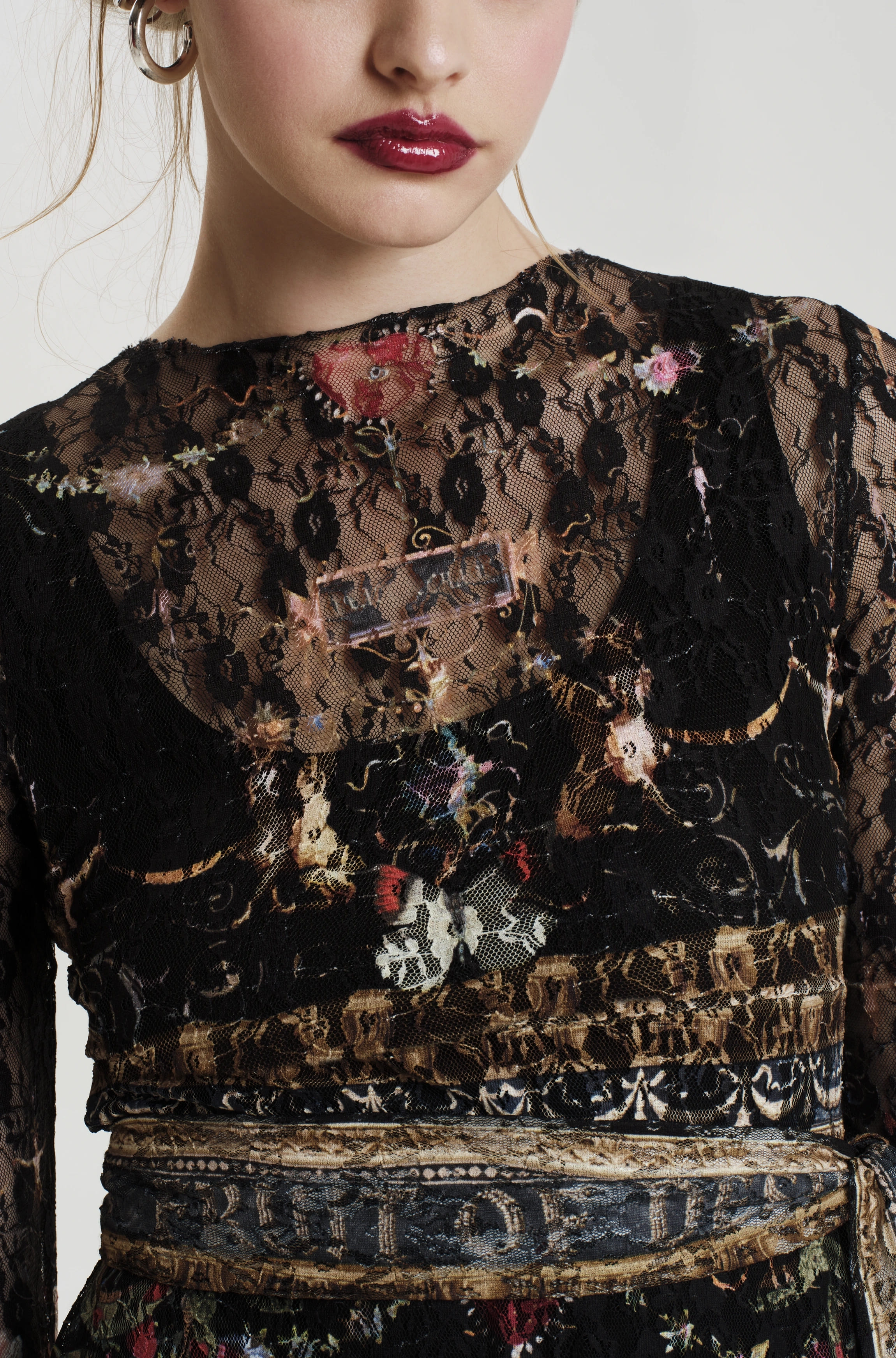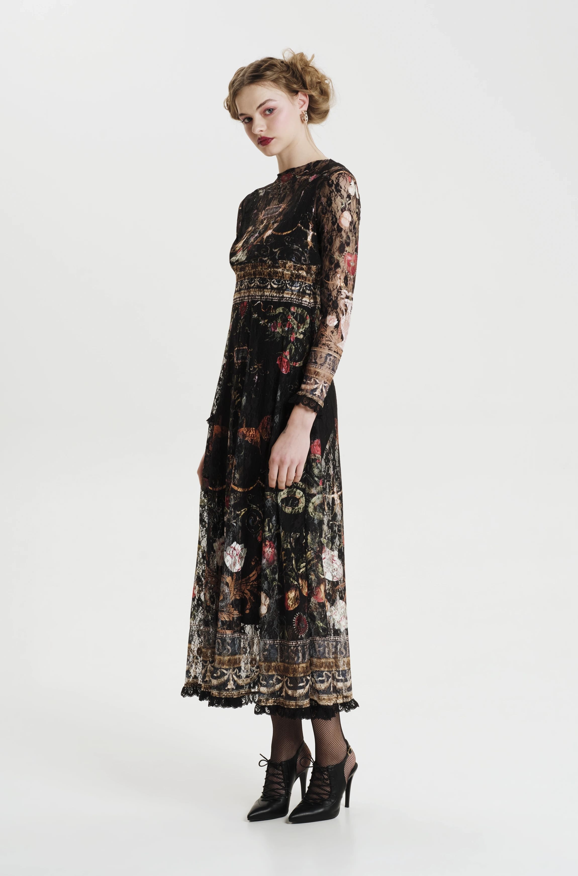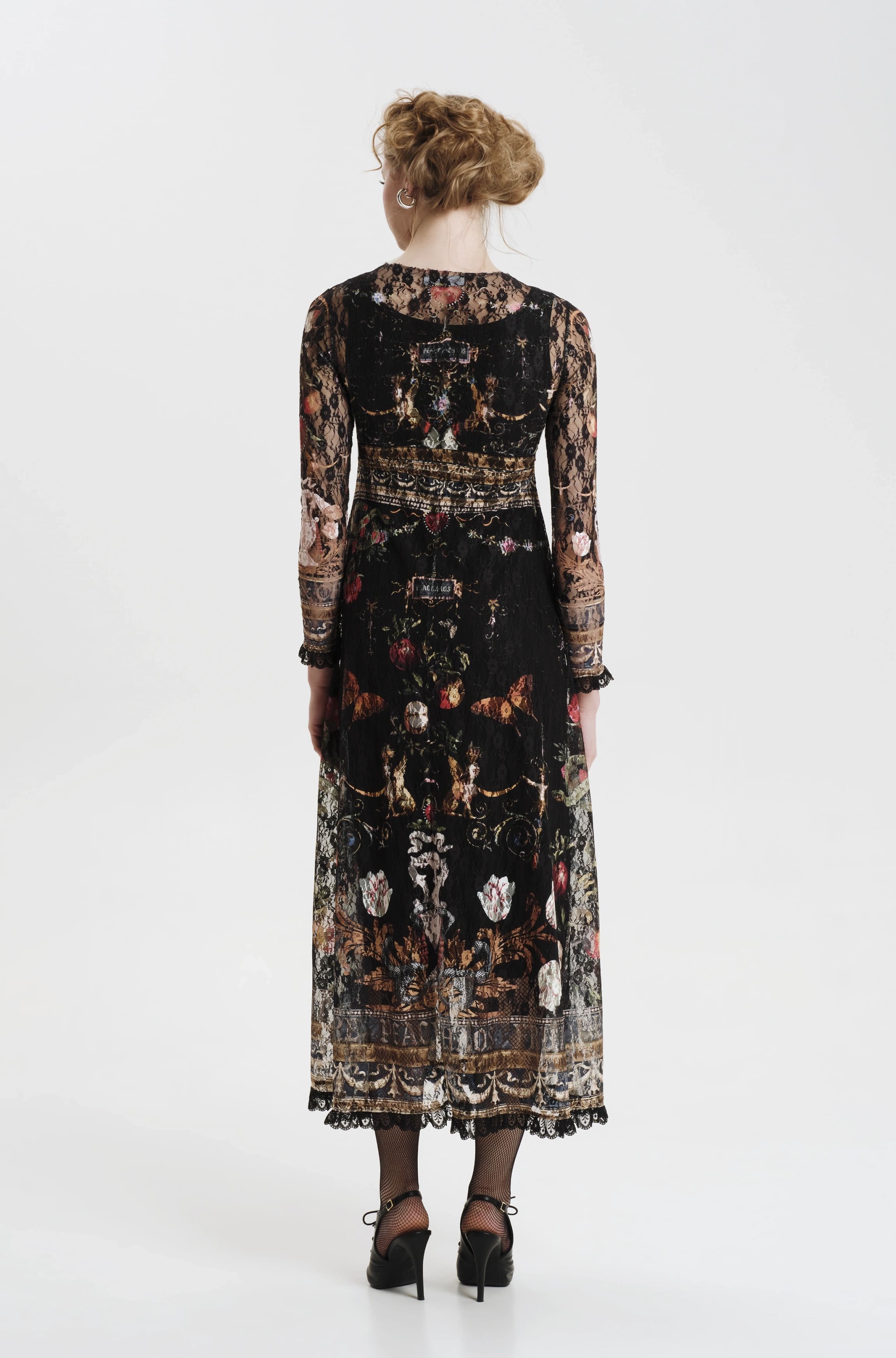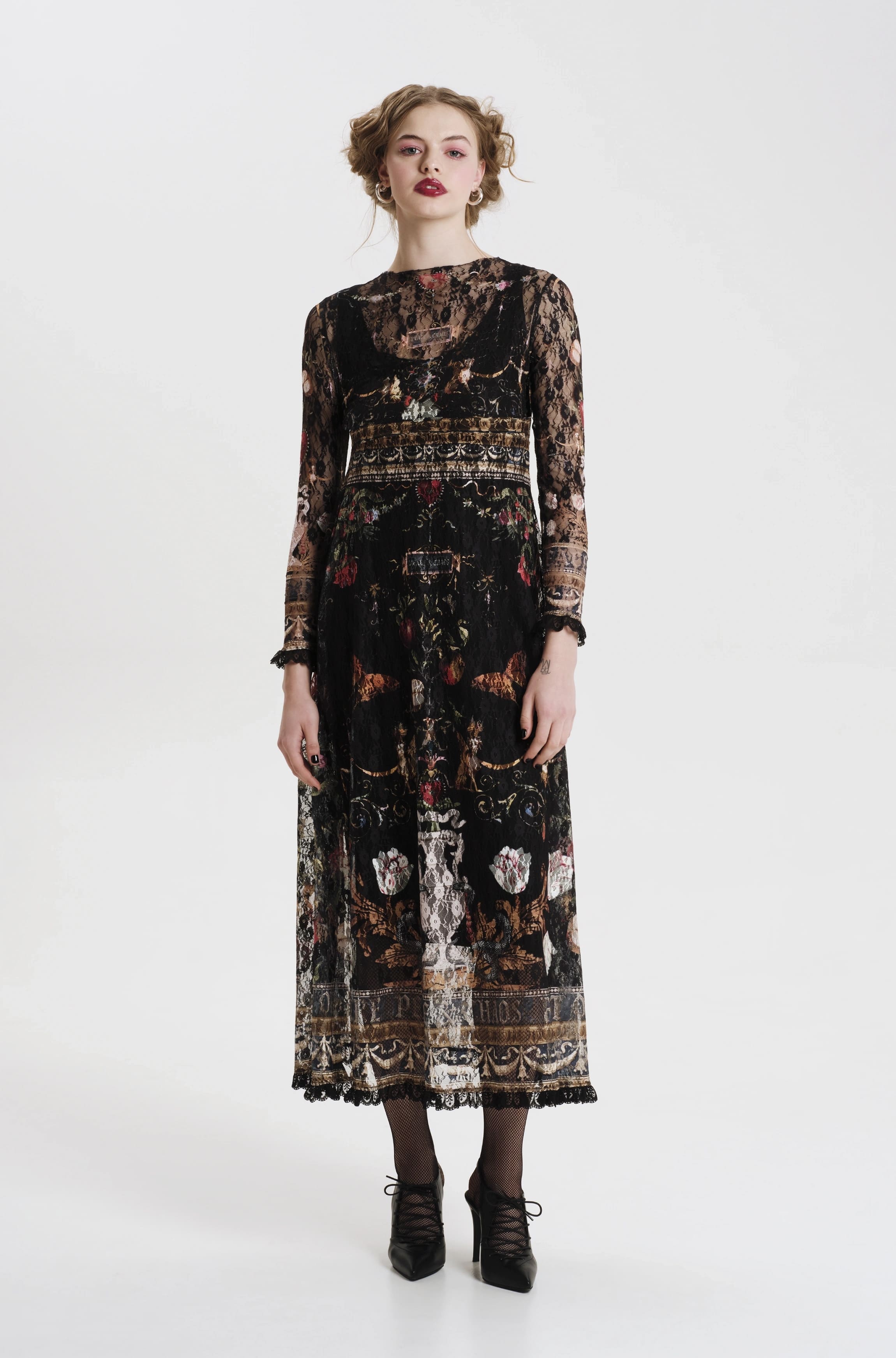 Το Temptation Long Dress ξεχωρίζει με το εντυπωσιακό σχέδιο του και τις διαφορετικές υφές του. Έχει A-line γραμμή και printed δαντέλα, ενώ φοριέται πάνω από ένα μαύρο slip dress από μαλακό ελαστικό τζέρσεϊ ύφασμα. Τα μακριά μανίκια και το τελείωμα του, έχουν μαύρη δαντέλα, ενώ η ζώνη του μπορεί να δεθεί στη μέση ή και στο λαιμό σαν φουλάρι, δίνοντας επιπλέον στυλ.