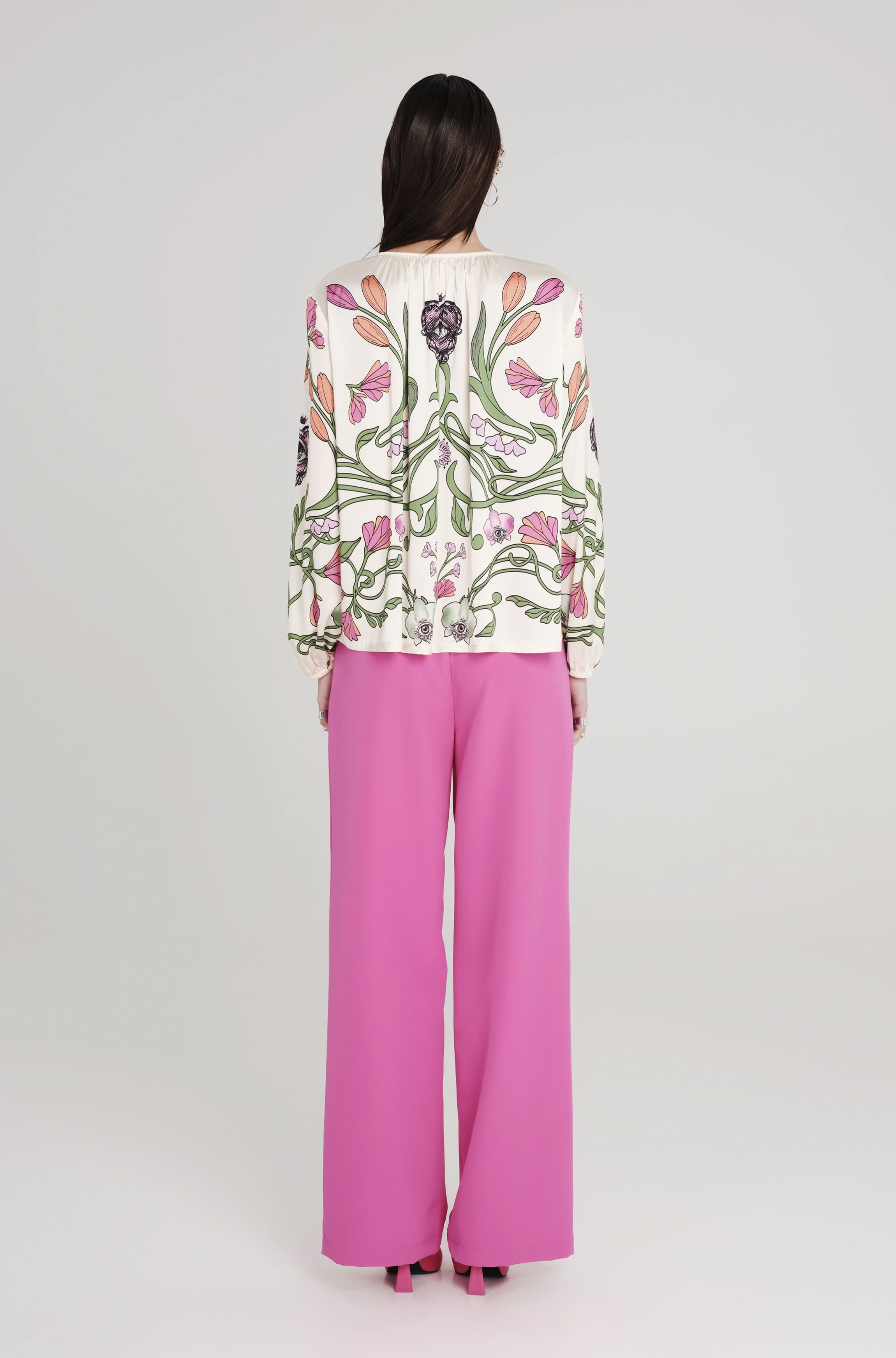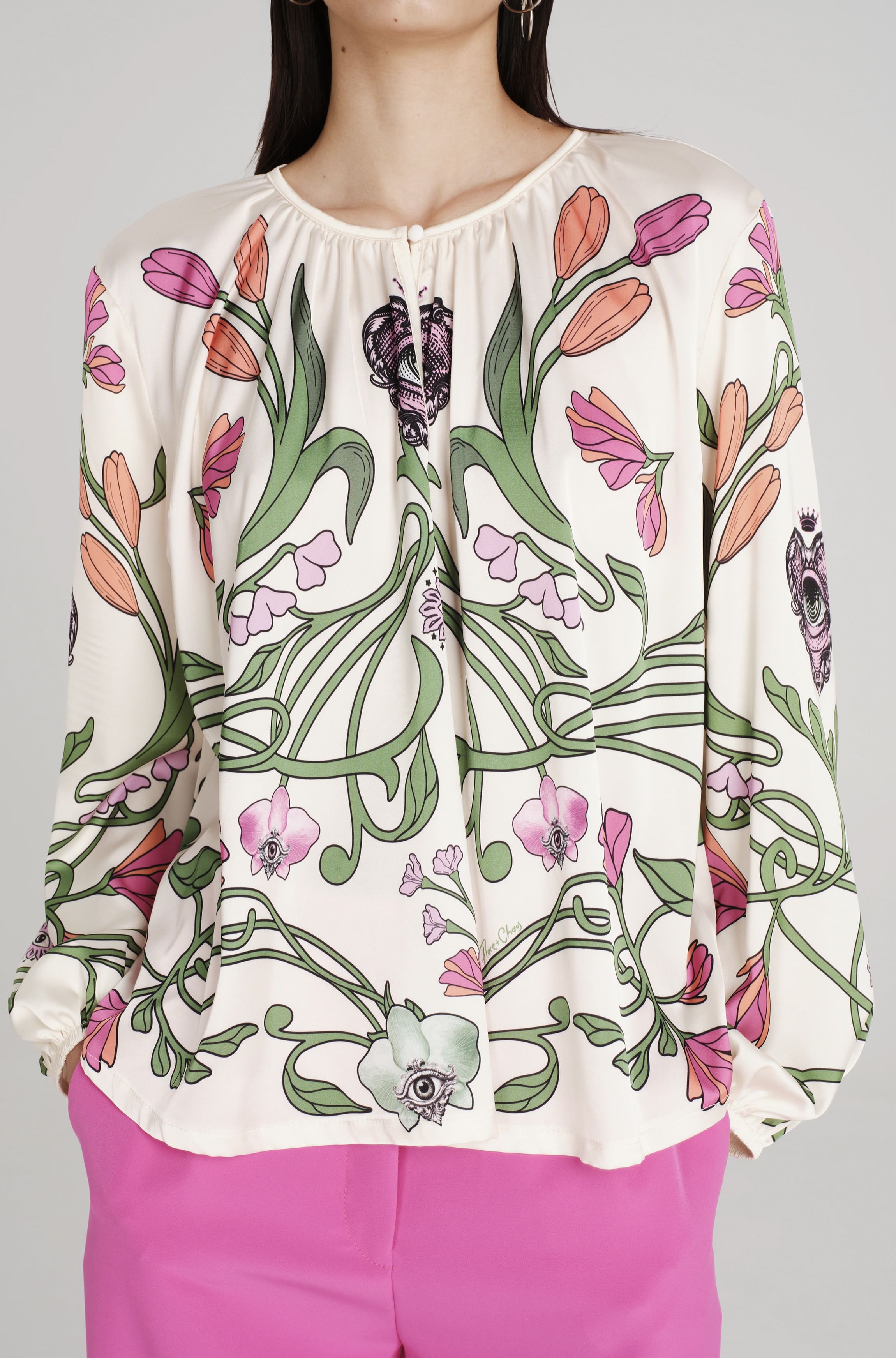 Το Fleur Top , έχει χαλαρή εφαρμογή, σούρα στη λαιμόκοψη και κλείνει με κουμπί. Έχει μακριά, φουσκωτά μανίκια με ελαστικό τελείωμα. Το floral σχέδιό του χαρίζει μια ανάλαφρη και αέρινη αίσθηση. Φοριέται εύκολα από το πρωί έως το βράδυ για ένα ξεχωριστό και άνετο look.