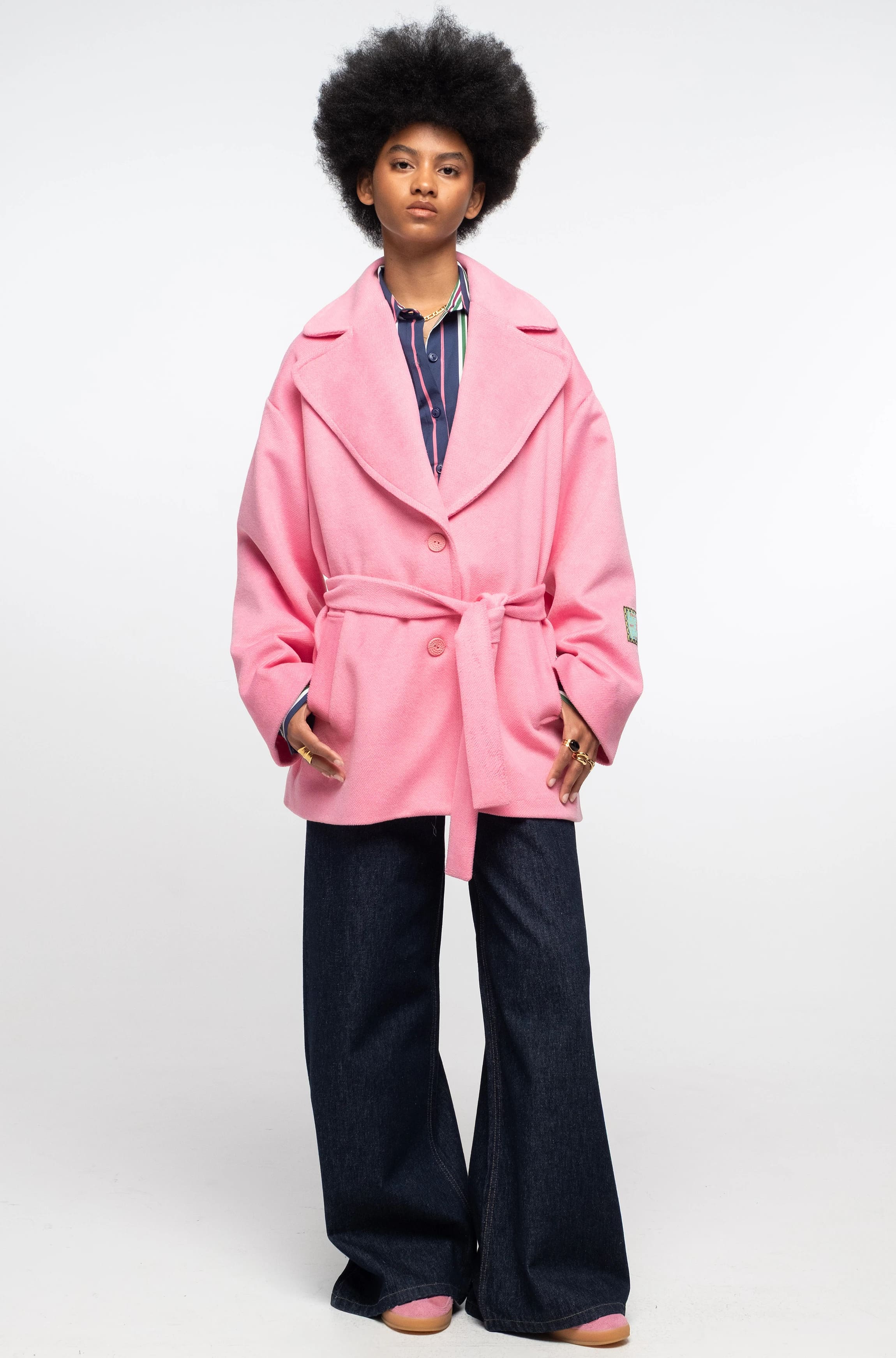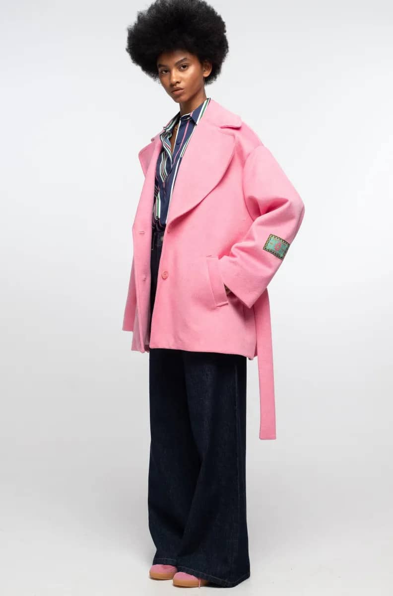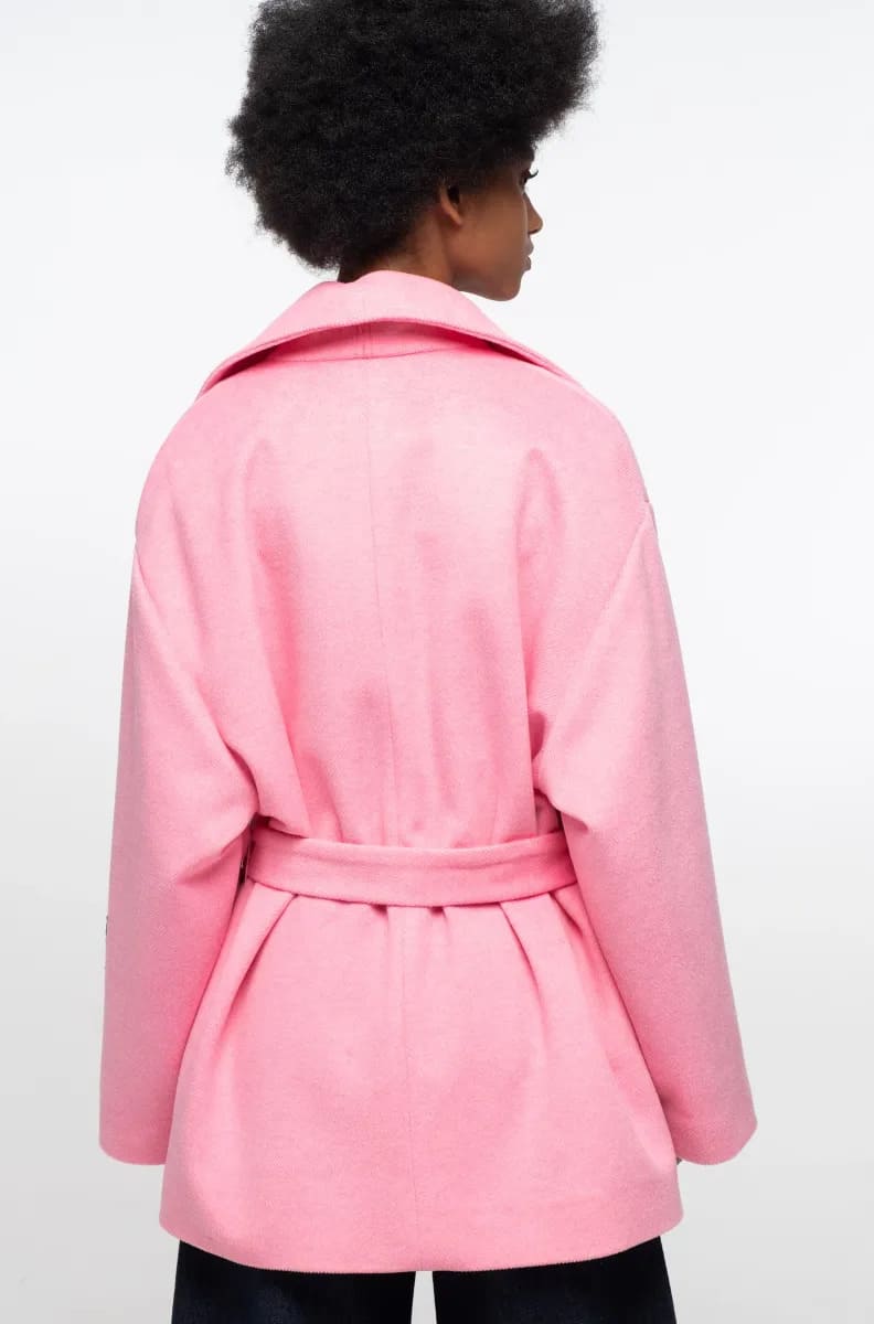 Το Cyclamen Coat σε bubble gum ροζ χρώμα, ξεχωρίζει με τις εντυπωσιακές του αναλογίες, όπως τον πολύ φαρδύ γιακά, τις μεγάλες τσέπες και τους χαλαρούς ώμους. Είναι κοντό, πλήρως επενδυμένο και έχει υφαντή ετικέτα P+C στο μανίκι. Κλείνει με κουμπιά μπροστά και διαθέτει ζώνη με θηλιές για να τονίζει τη μέση.