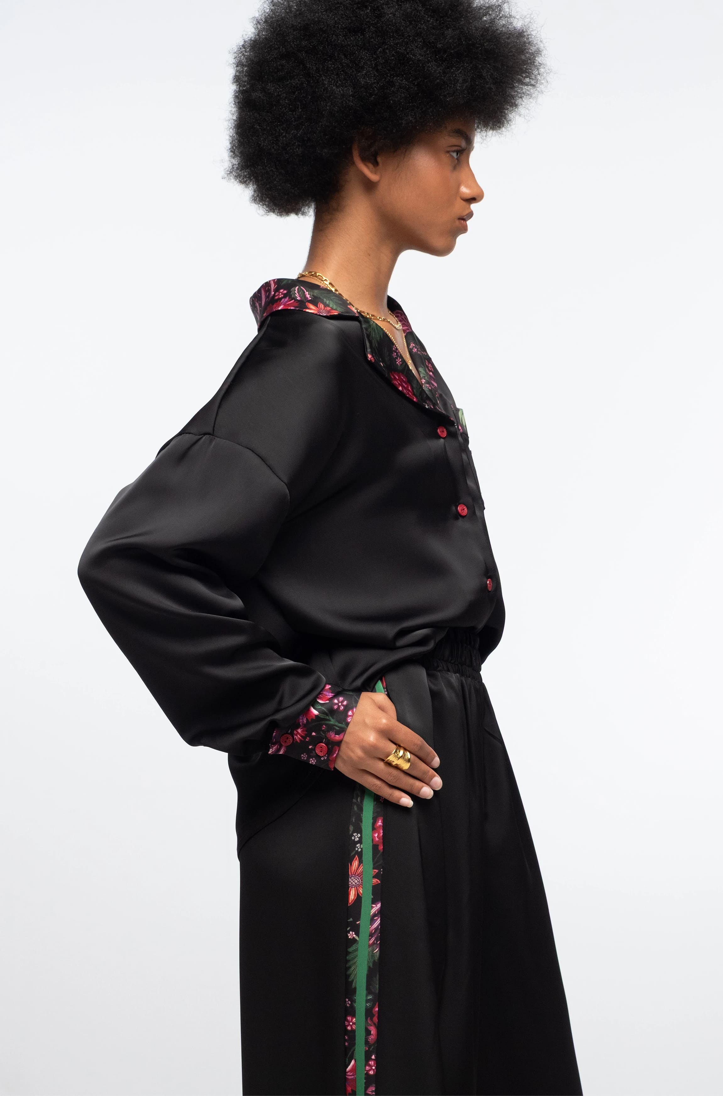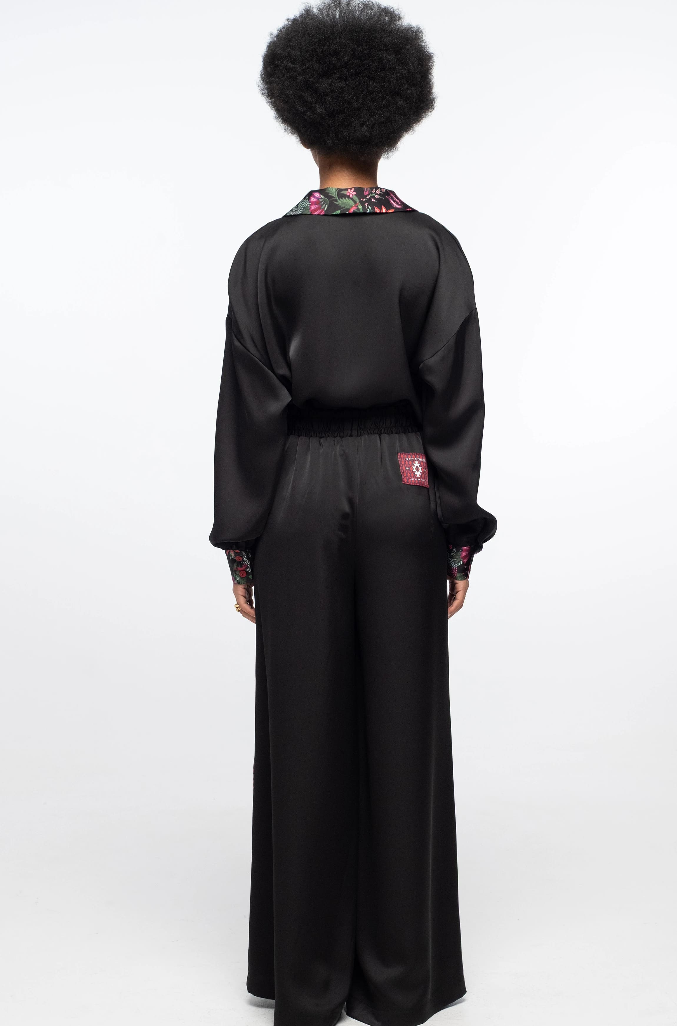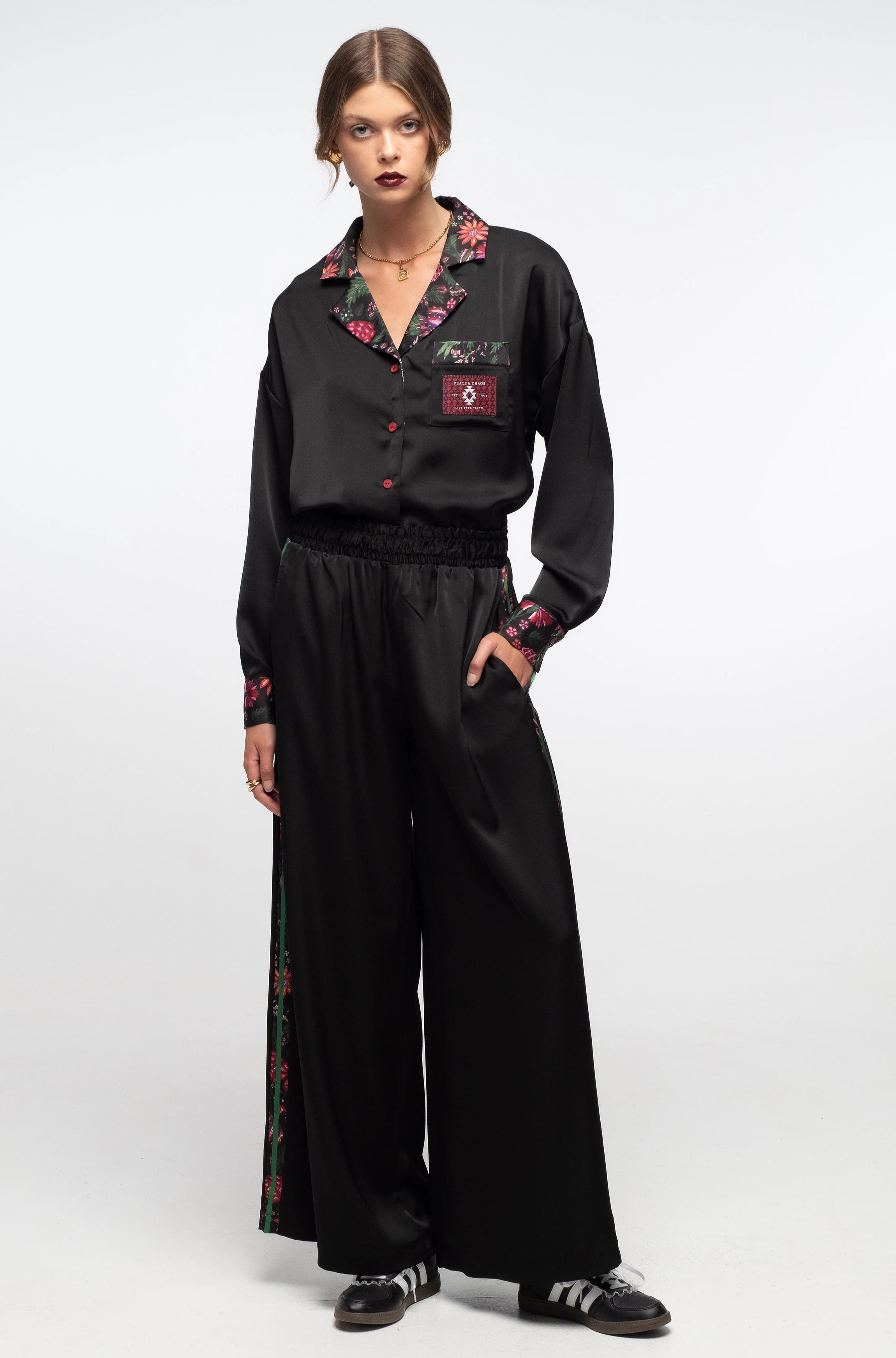 Το Bloom Pants είναι η τέλεια επιλογή για άνεση και στυλ. Είναι φτιαγμένο από μαύρο, σατέν ύφασμα που αγκαλιάζει απαλά το σώμα, με διακριτική ρίγα στο πλάι με print με floral στοιχεία. Έχει χαλαρή και ίσια γραμμή, λάστιχο στη μέση και πλαϊνές τσέπες για έξτρα πρακτικότητα. Συνδυάστε το με το ασορτί Bloom Shirt για ένα άνετο pyjama-style.