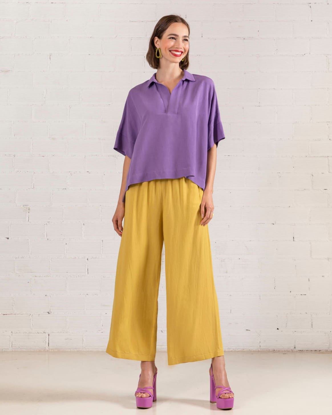 Σύνθεση: 75%RAY 25%LIN Χαρακτηριστικά: ψηλόμεση παντελόνα τσέπες στο πλάι λάστιχο στη μέση wide leg κανονική εφαρμογή χρώμα ώχρα ...Read more