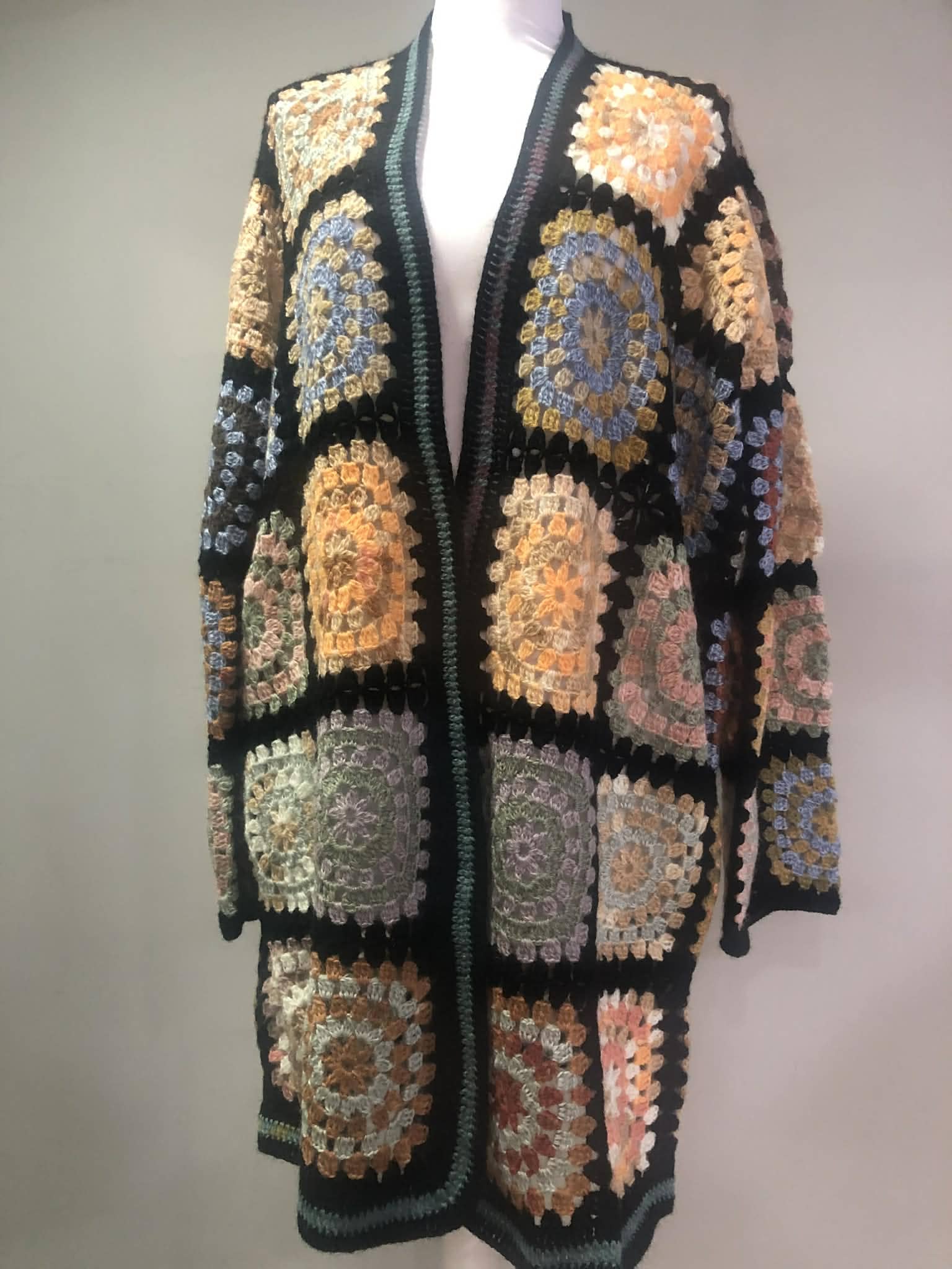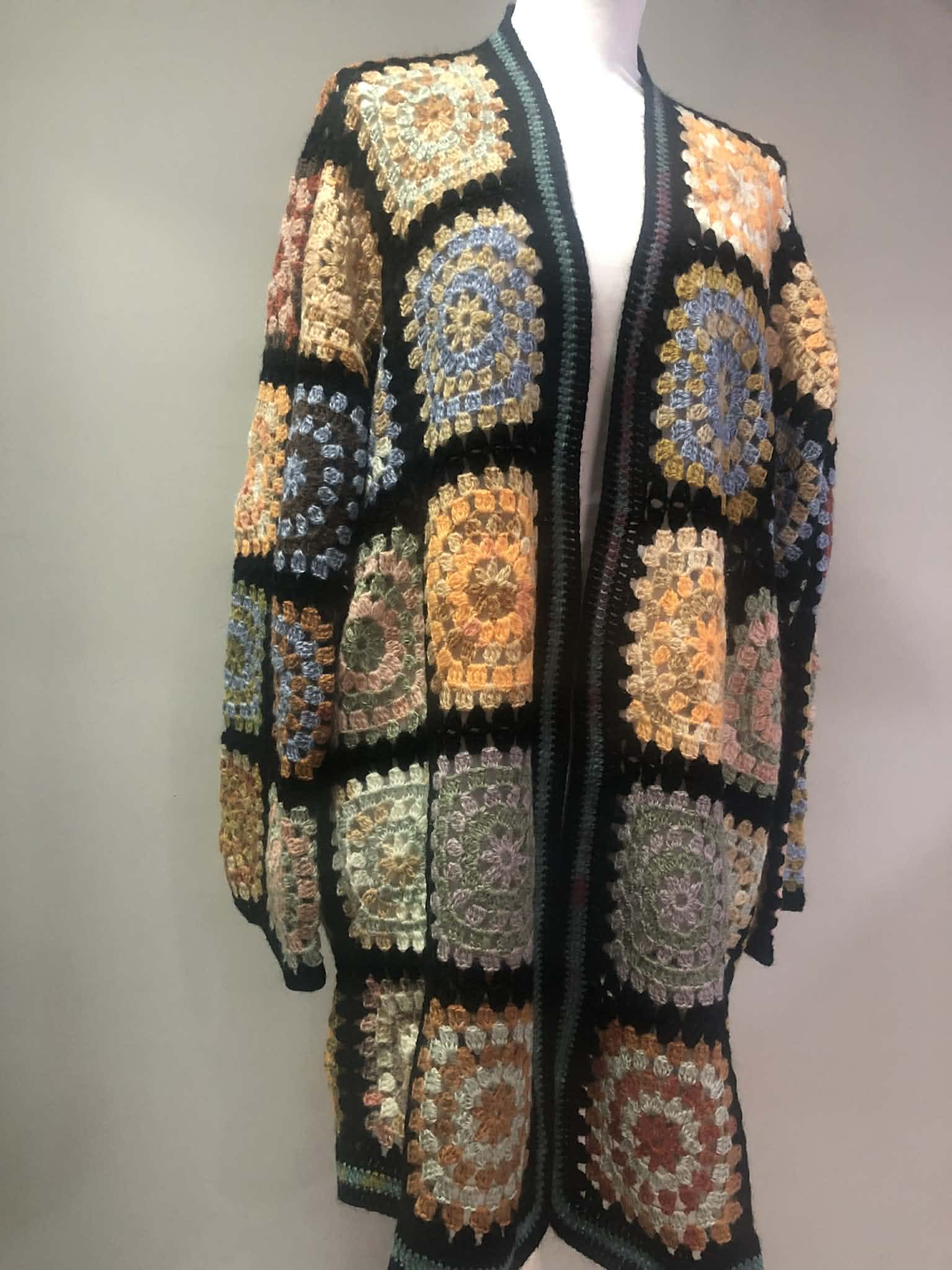 Χειροποίητη πλεκτή ζακέτα σε στυλ boho, με πολύχρωμα μοτίβα granny squares που χαρίζουν μοναδικό χαρακτήρα. Άνετη γραμμή και απαλή υφή, ιδανική για καθημερινές εμφανίσεις με ιδιαίτερο στυλ. Συνδυάζεται εύκολα και προσθέτει ζεστασιά και χρώμα σε κάθε outfit.