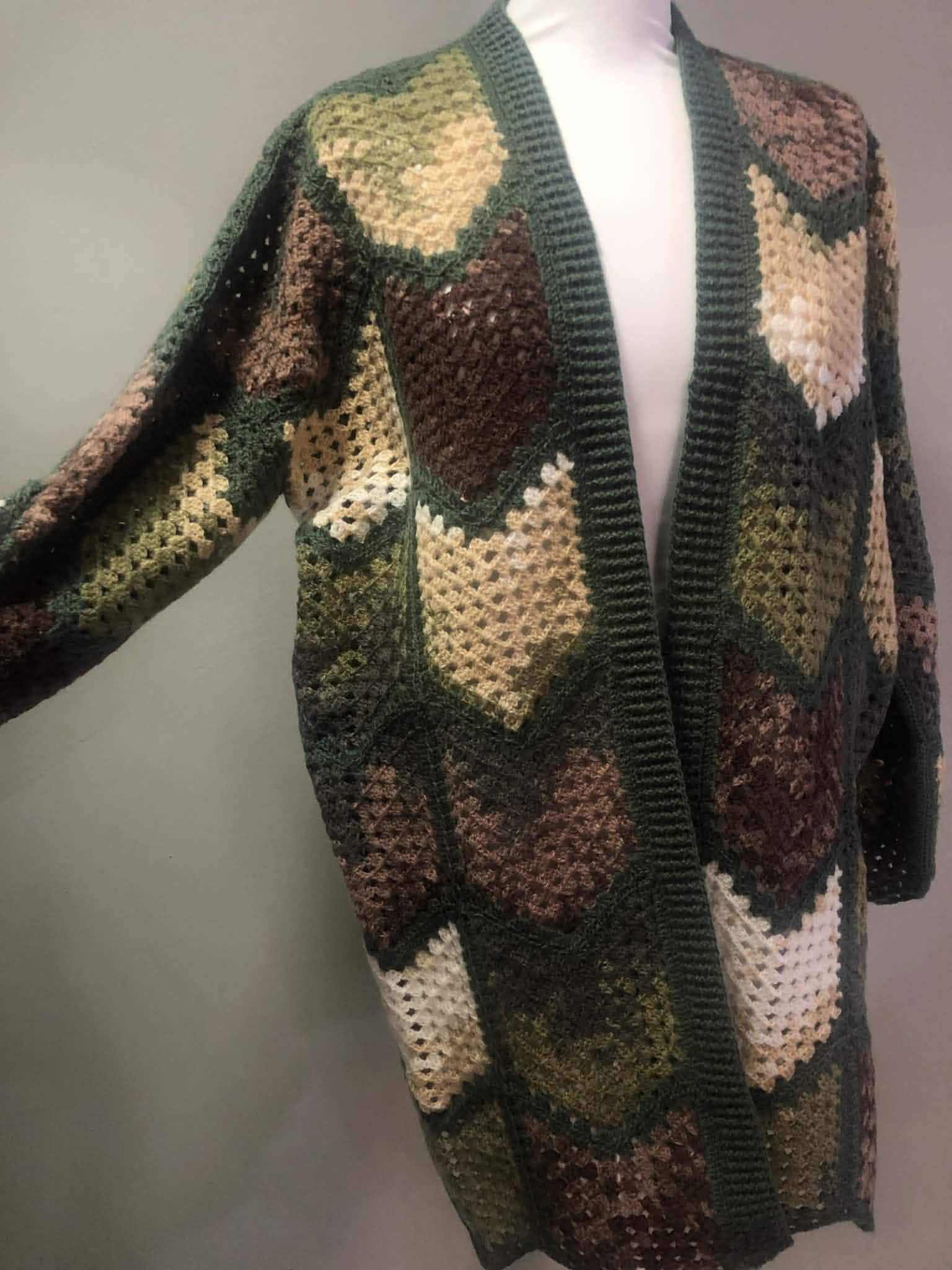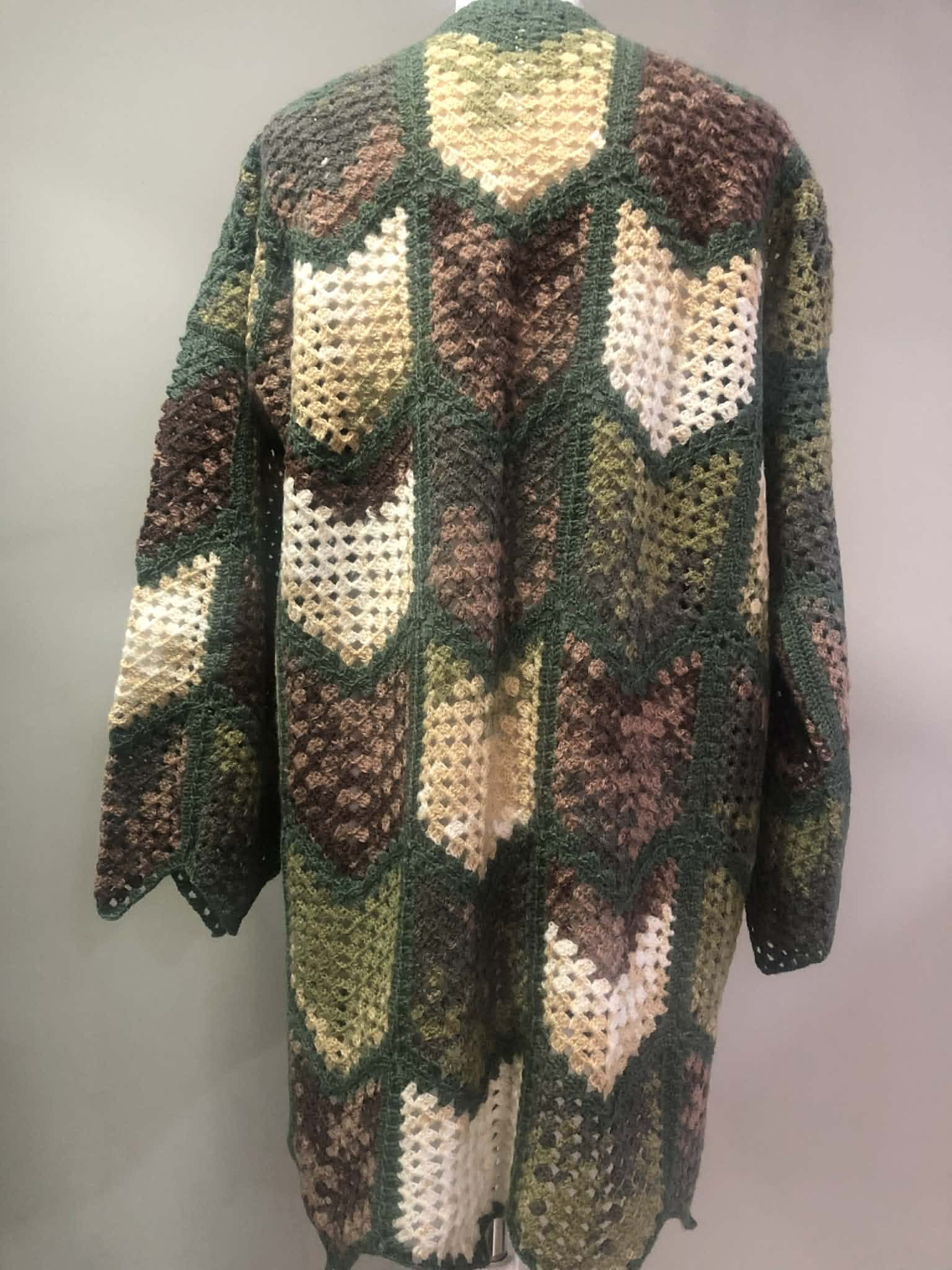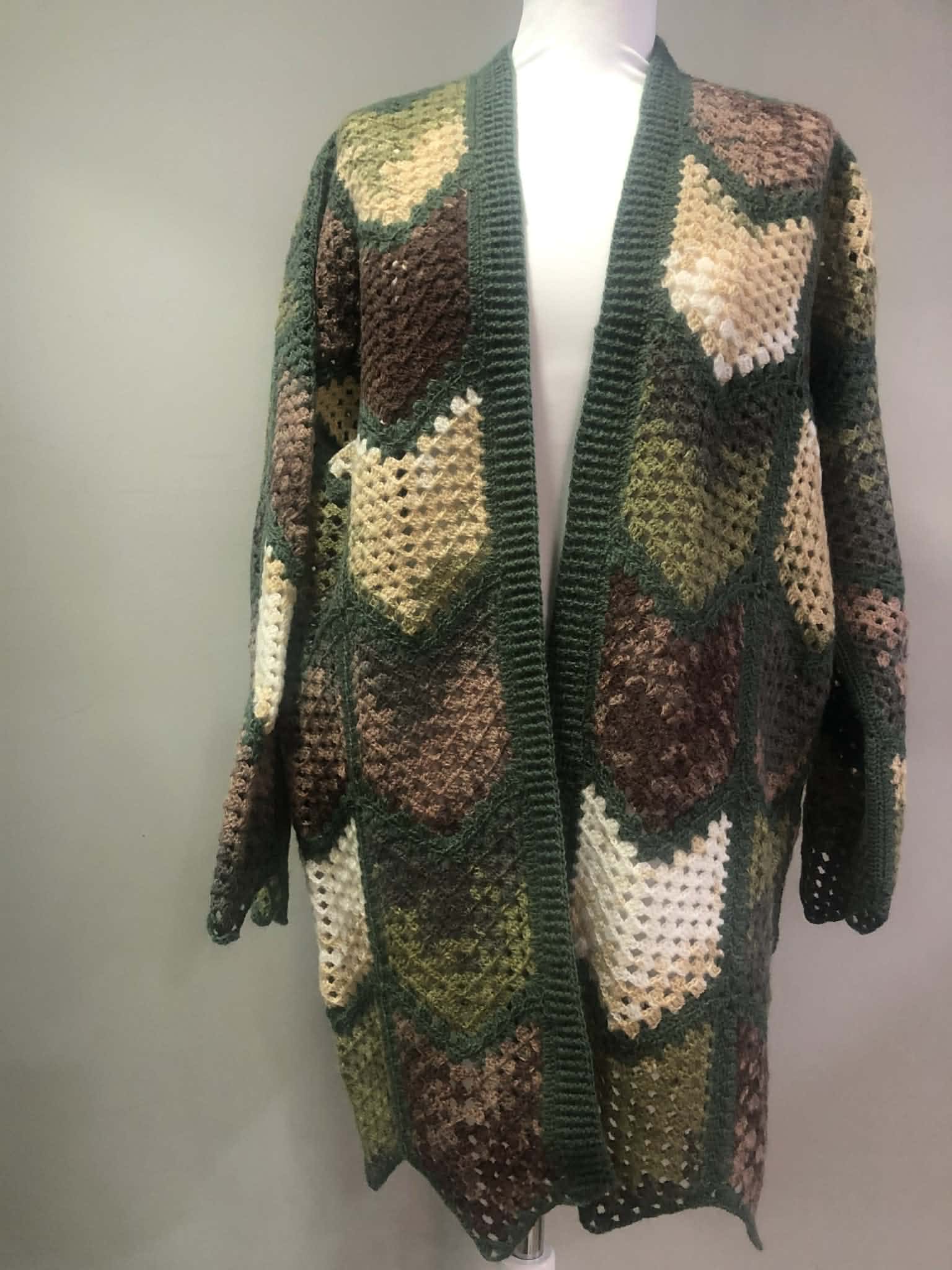 Μακριά χειροποίητη ζακέτα crochet με μοναδικό patchwork σχέδιο σε γήινες αποχρώσεις πράσινου, καφέ και εκρού. Ζεστή και άνετη, προσθέτει χαρακτήρα σε κάθε casual εμφάνιση και φοριέται από το πρωί μέχρι το βράδυ.